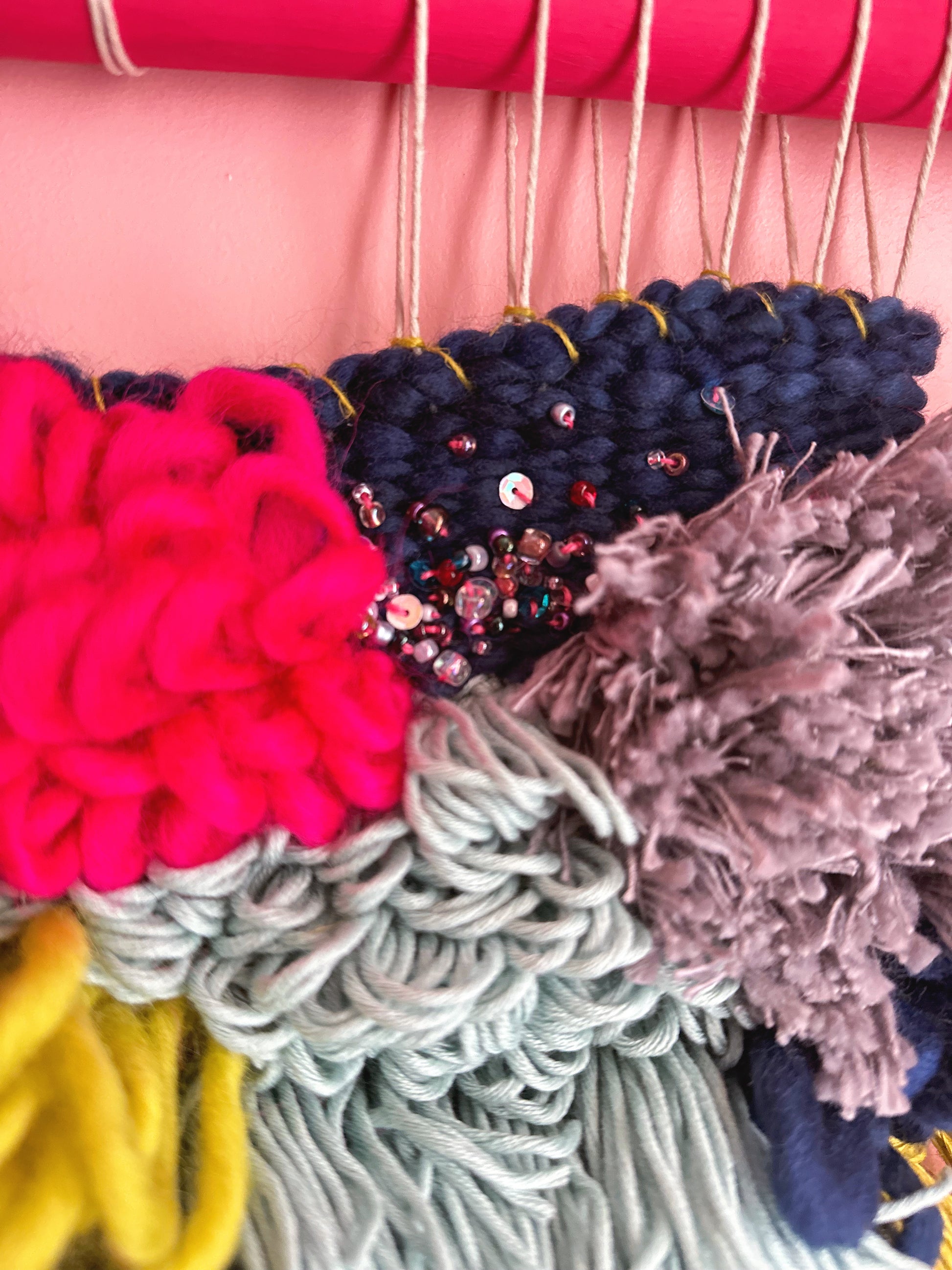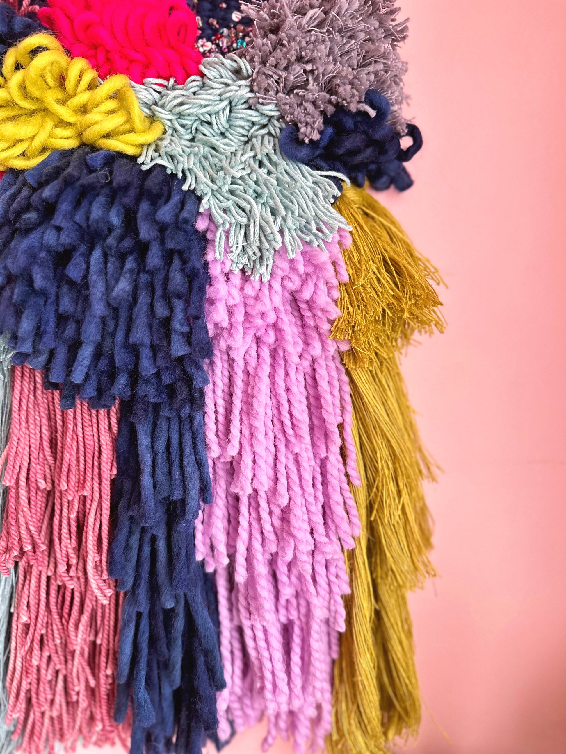 This weaving is made from a variety of high quality natural fibres including linen, wool, and cotton. A small section of the weaving has been hand beaded, and it hangs on a hand-painted wood dowel. This will definitely be a focal point in any home! This weaving is super textural and vibrant - a bold and whimsical piece!
