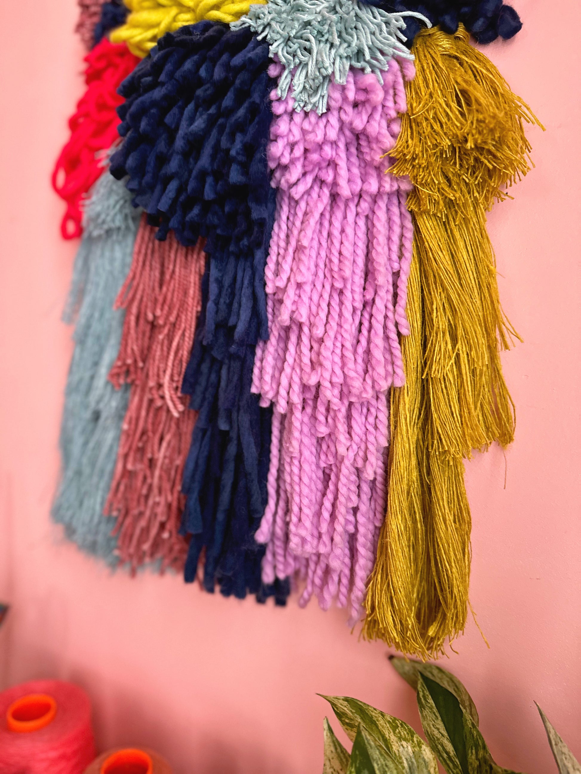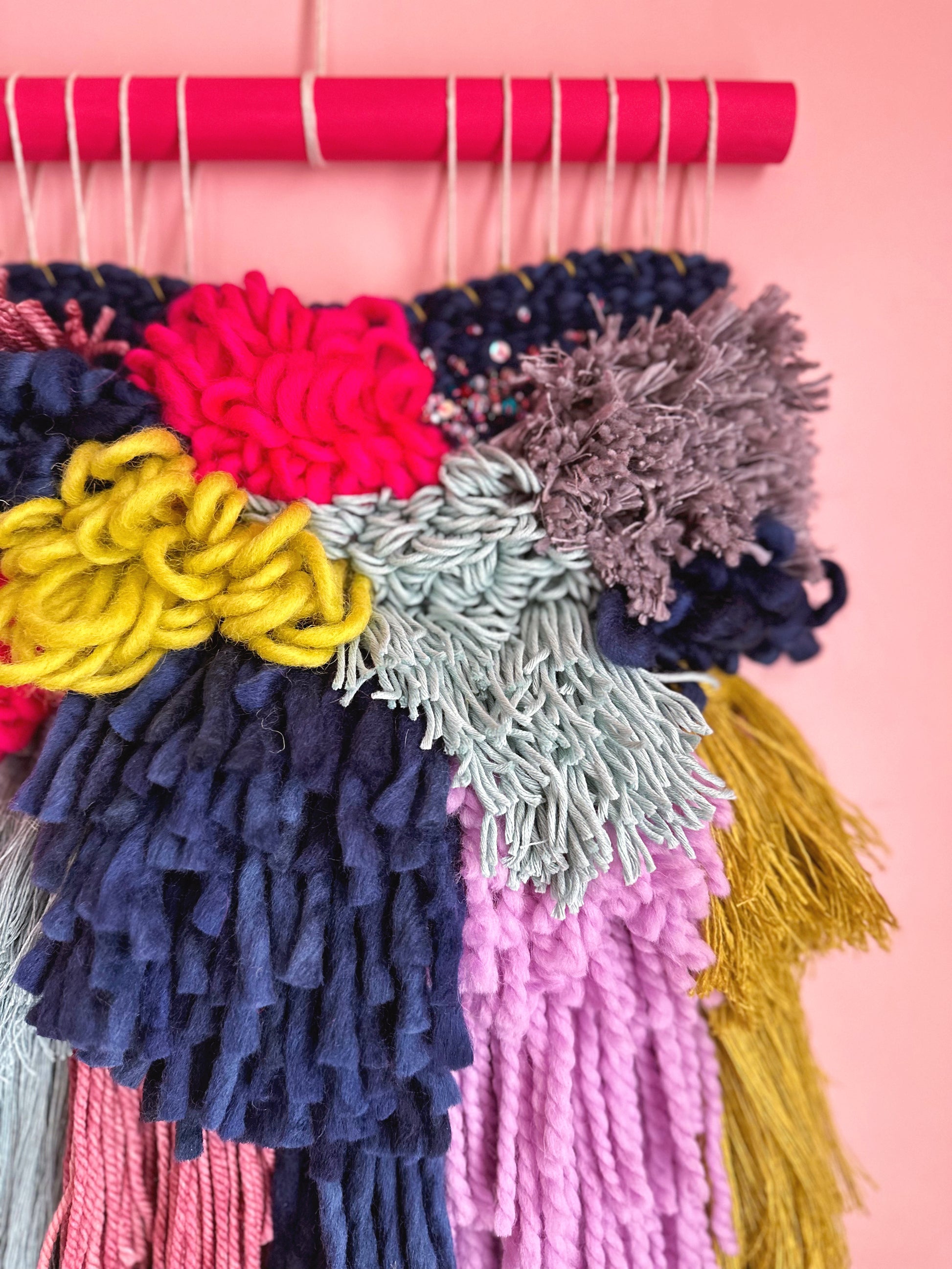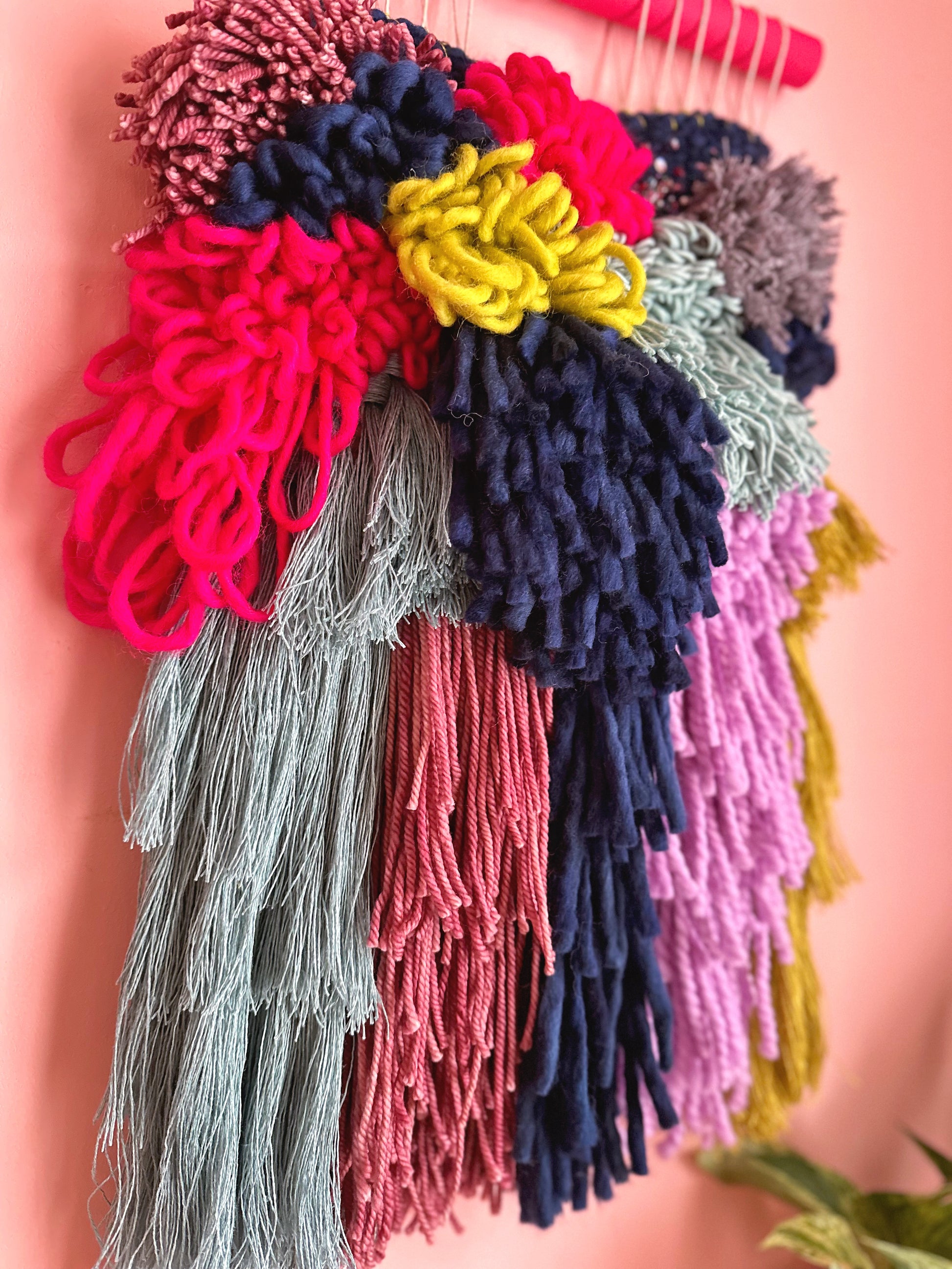 This beautiful and unique wall hanging is designed and handmade by me in my Montréal home. It is soft, textured, and cheerful, and will add colour and interest to any room.