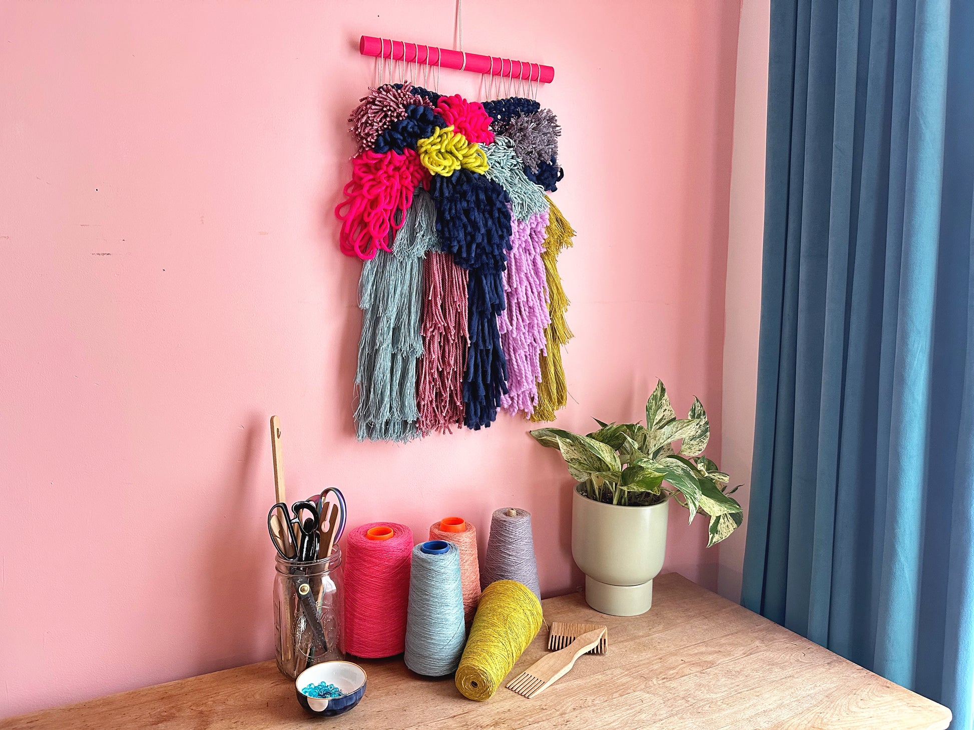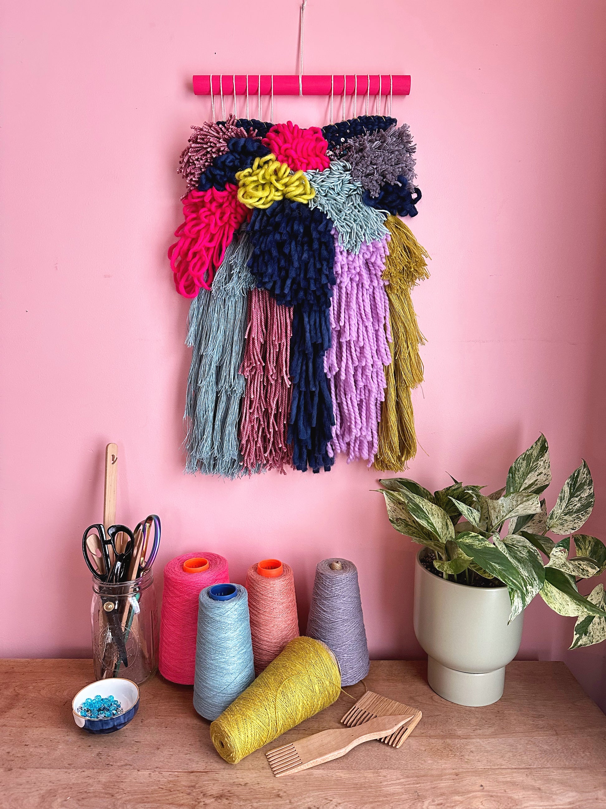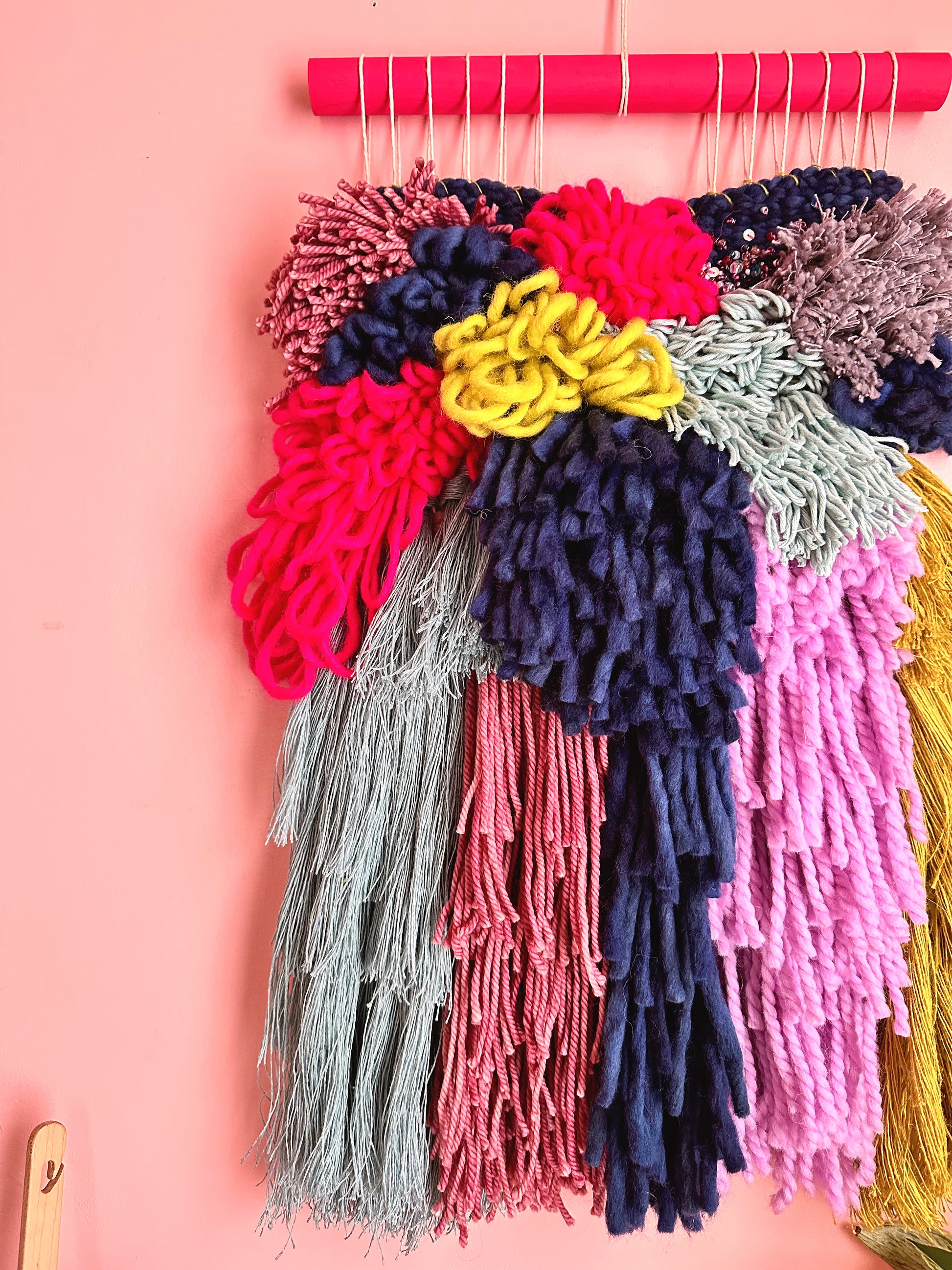 This beautiful and unique wall hanging is designed and handmade by me in my Montréal home. It is soft, textured, and cheerful, and will add colour and interest to any room.